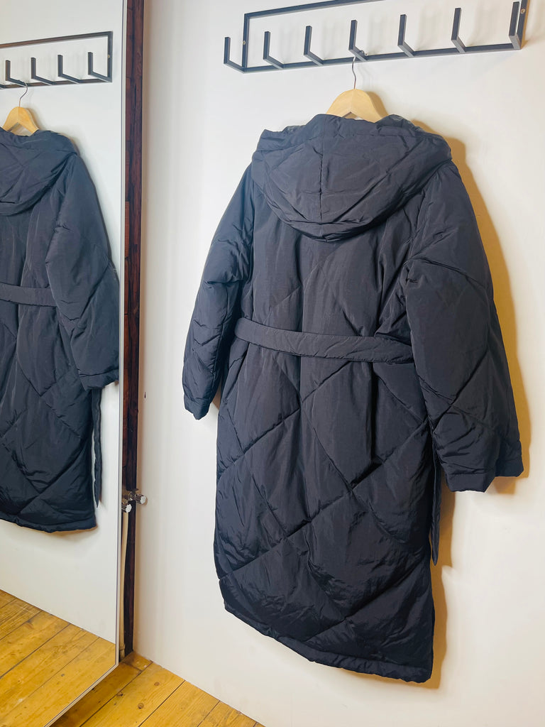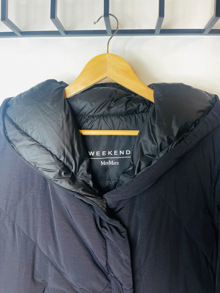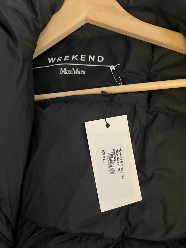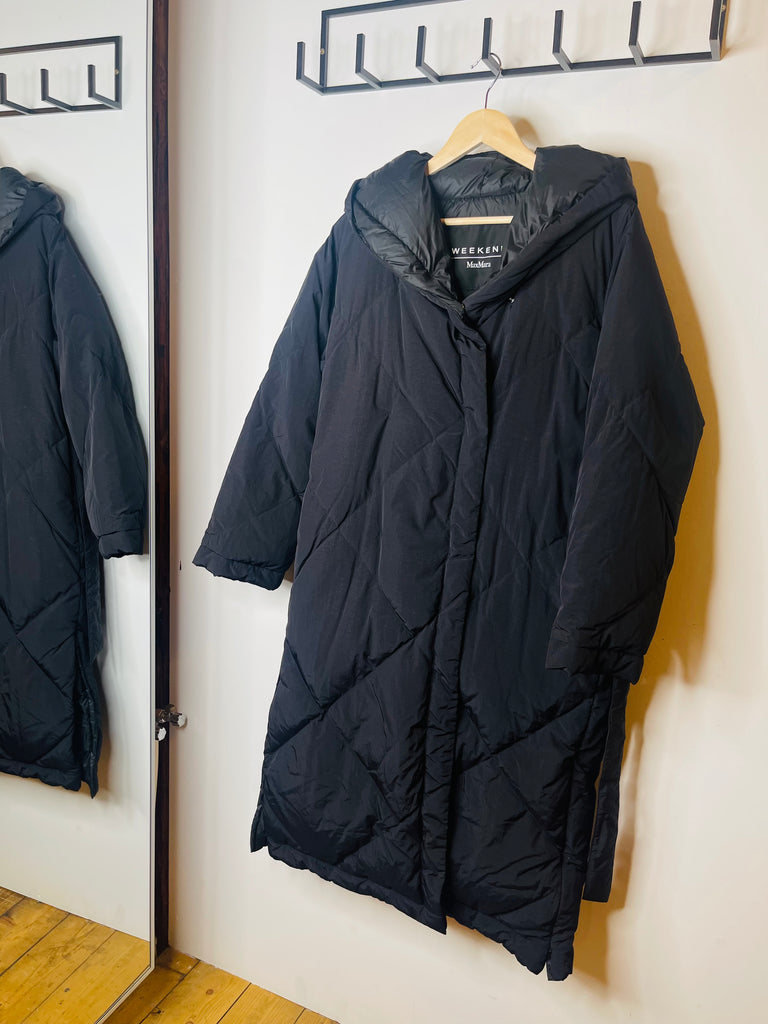 Æðisleg og klæðileg Weekend Max Mara síð puffer úlpa m/belti og hettu í svörtu.