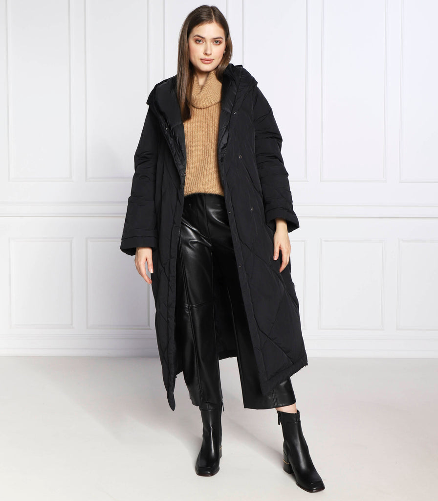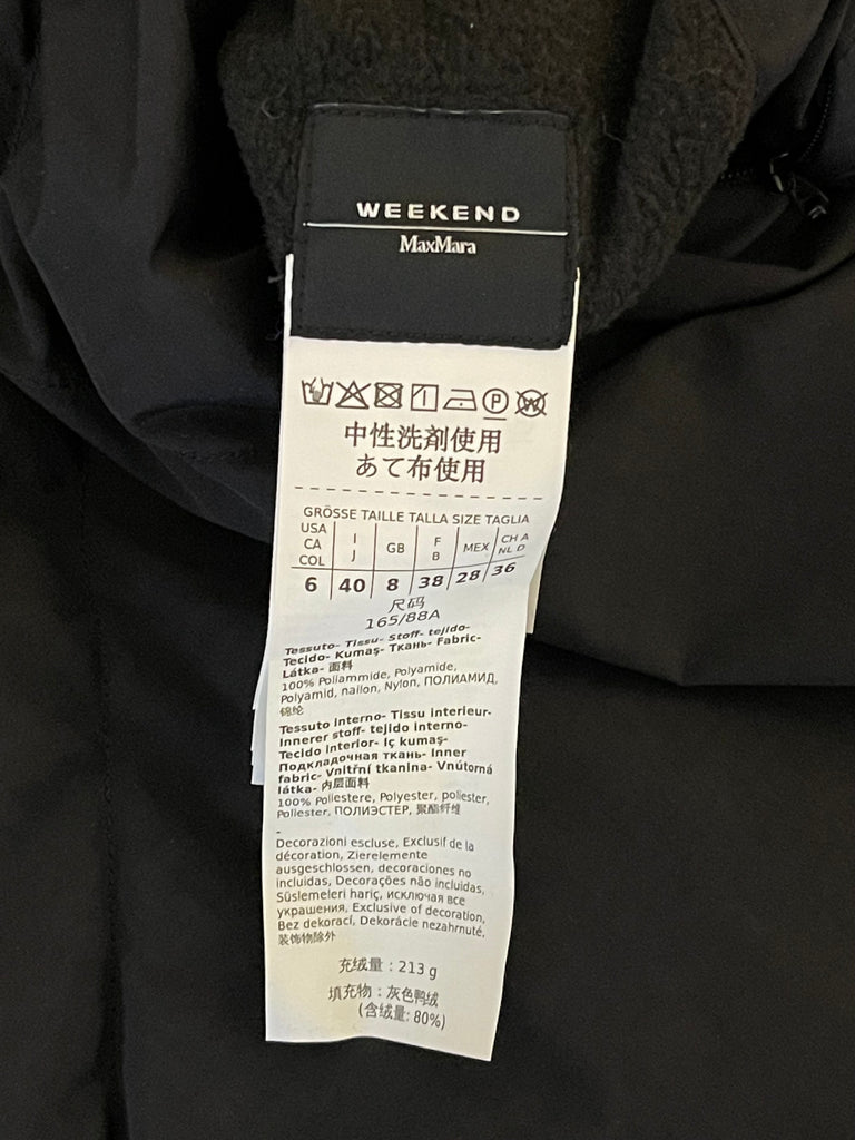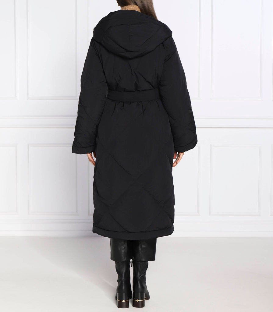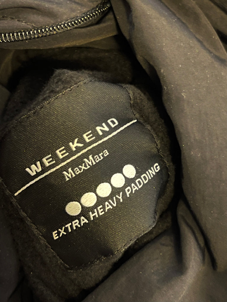 Æðisleg og klæðileg Weekend Max Mara síð puffer úlpa m/belti og hettu í svörtu.