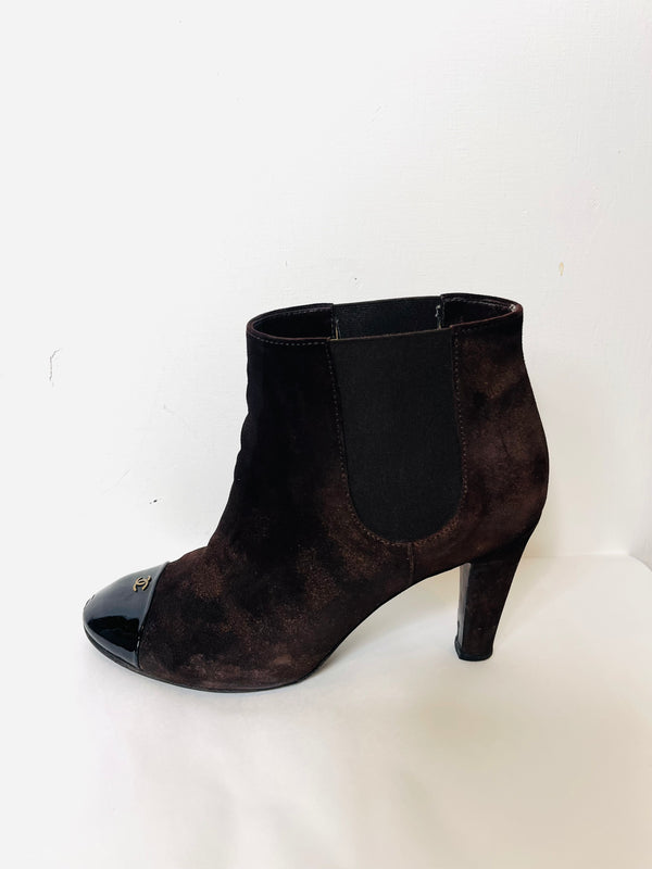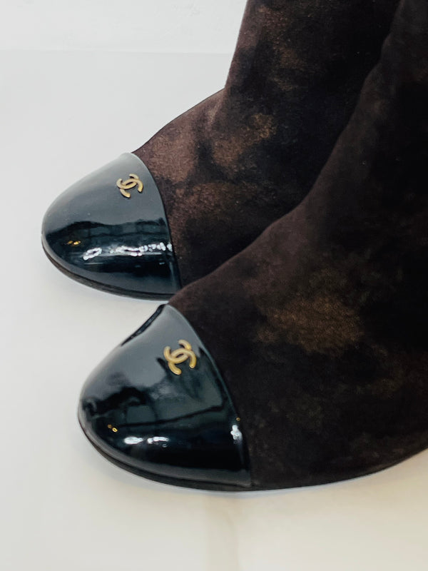 Á útsöluChanel, brún suede/patent leður logo toe stígvél (40,5)